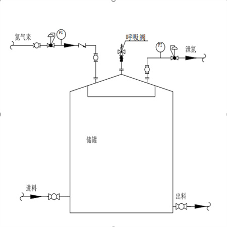 1. 氮封装置由快速泄放阀和微压调节阀组成,快速泄放阀由压力控制器和单座切断阀组成,当罐内压力升高到设定压力时,快速泄放阀打开,将罐内多余压力泄放。微压调节阀是在储罐内压力降低时,开启阀门,向罐内充注氮气。